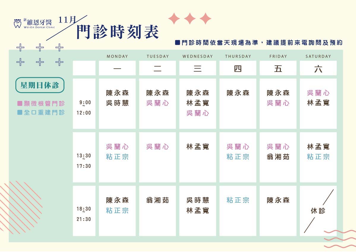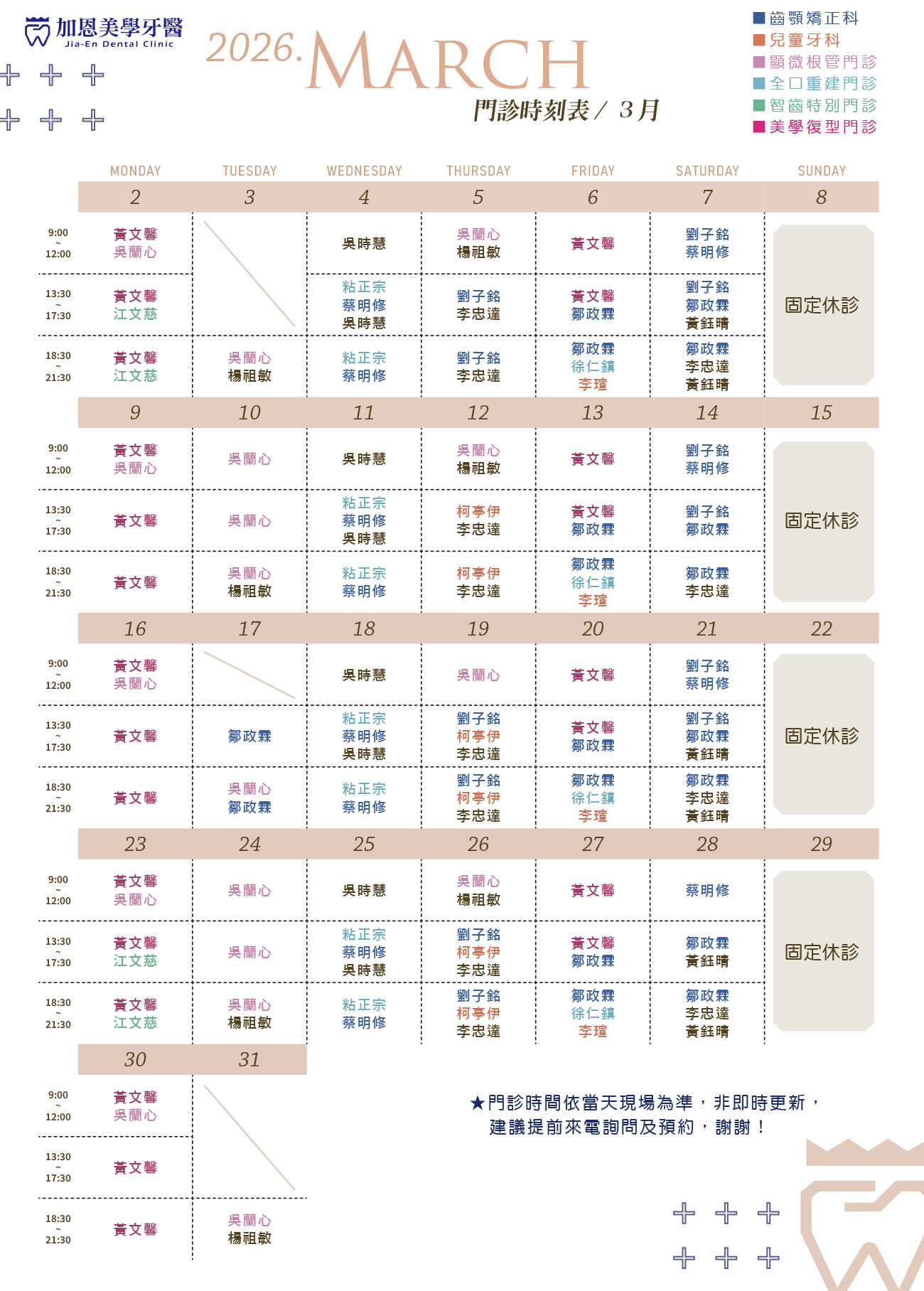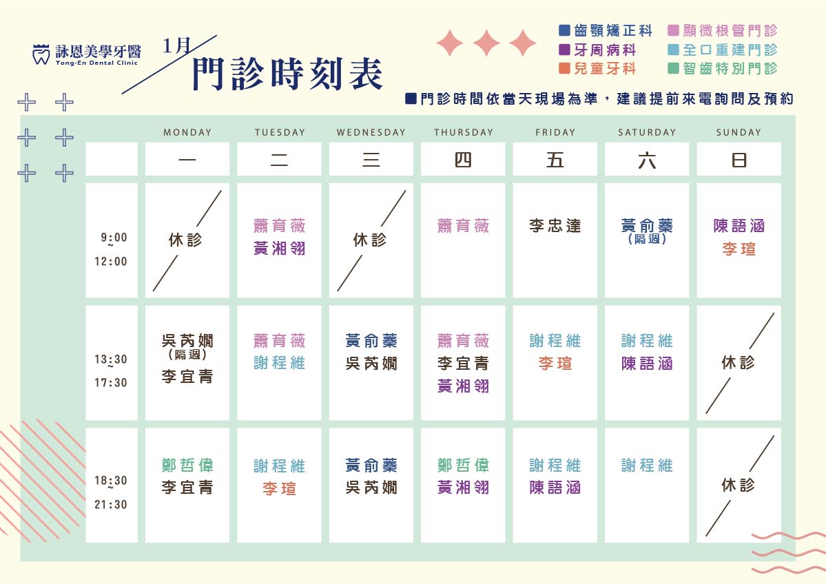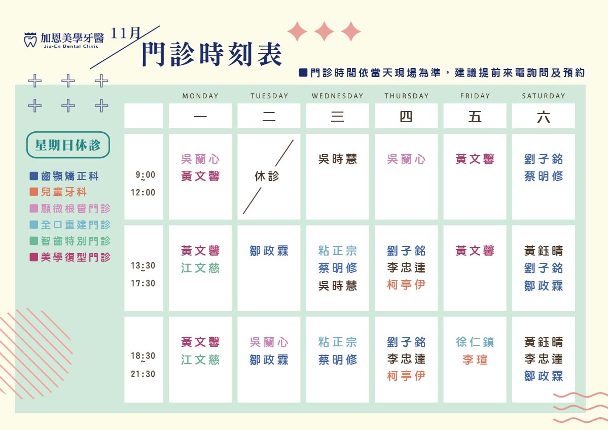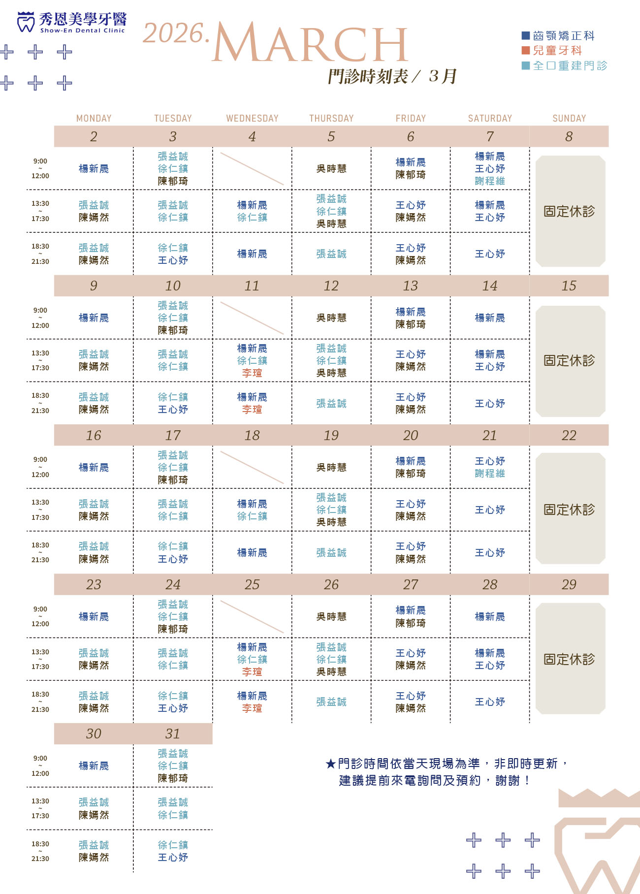 週一至六:9:00 – 12:00 / 13:30 – 17:30 / 18:30 – 21:30