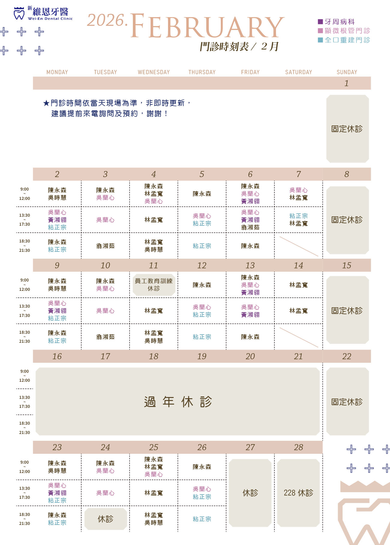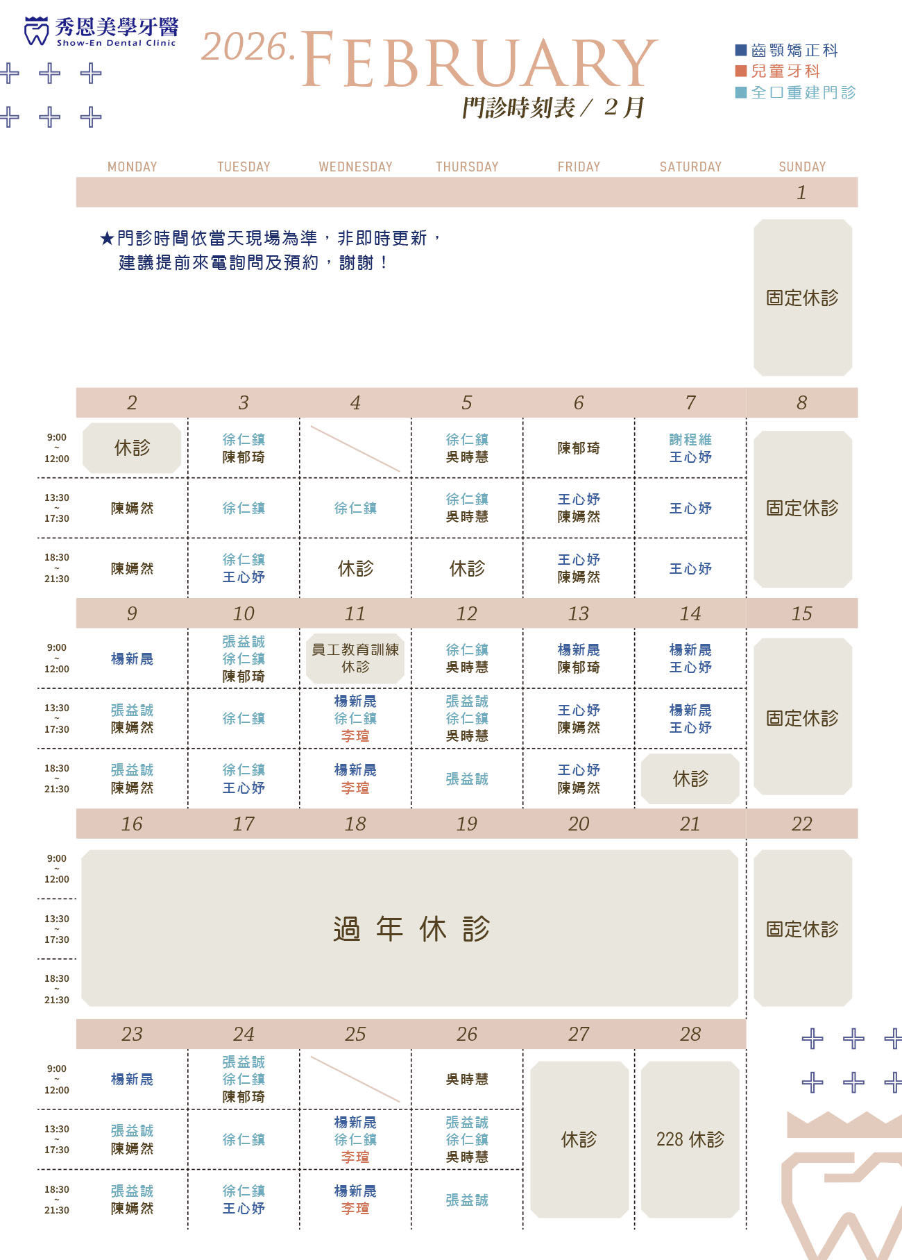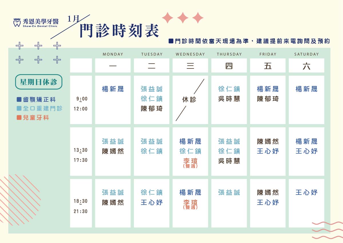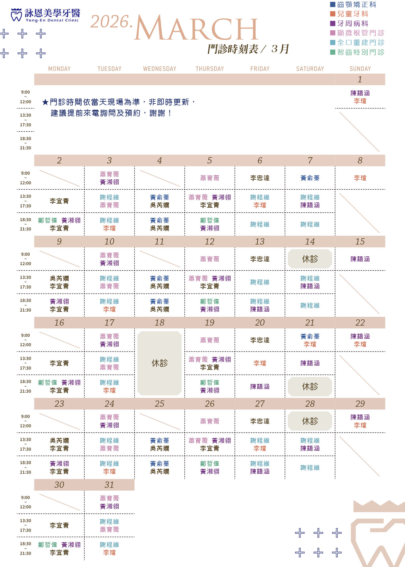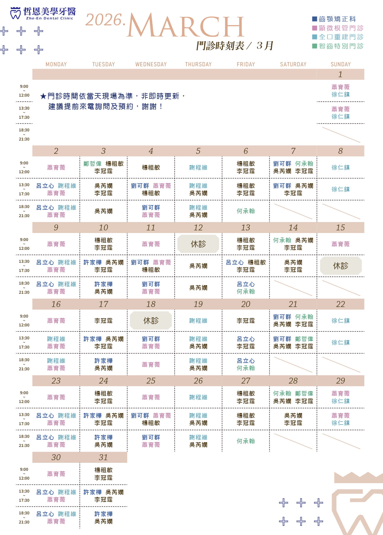 週一至六:9:00 – 12:00 / 13:30 – 17:30 / 18:30 – 21:30