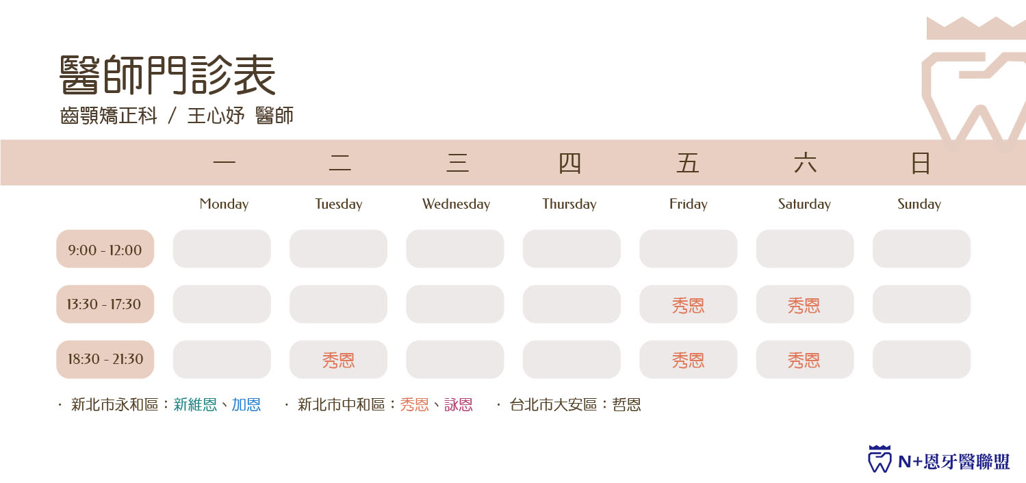 服務區域:詠恩衛福部部定齒顎矯正專科醫師中華民國齒顎矯正學會專科醫師臺大醫院齒顎矯正專科訓練前臺大醫院新竹分院牙科部總醫師國立臺灣大學齒顎矯正碩士國立臺灣大學牙醫學系學士隱適美Invisalign隱形矯正認證醫師