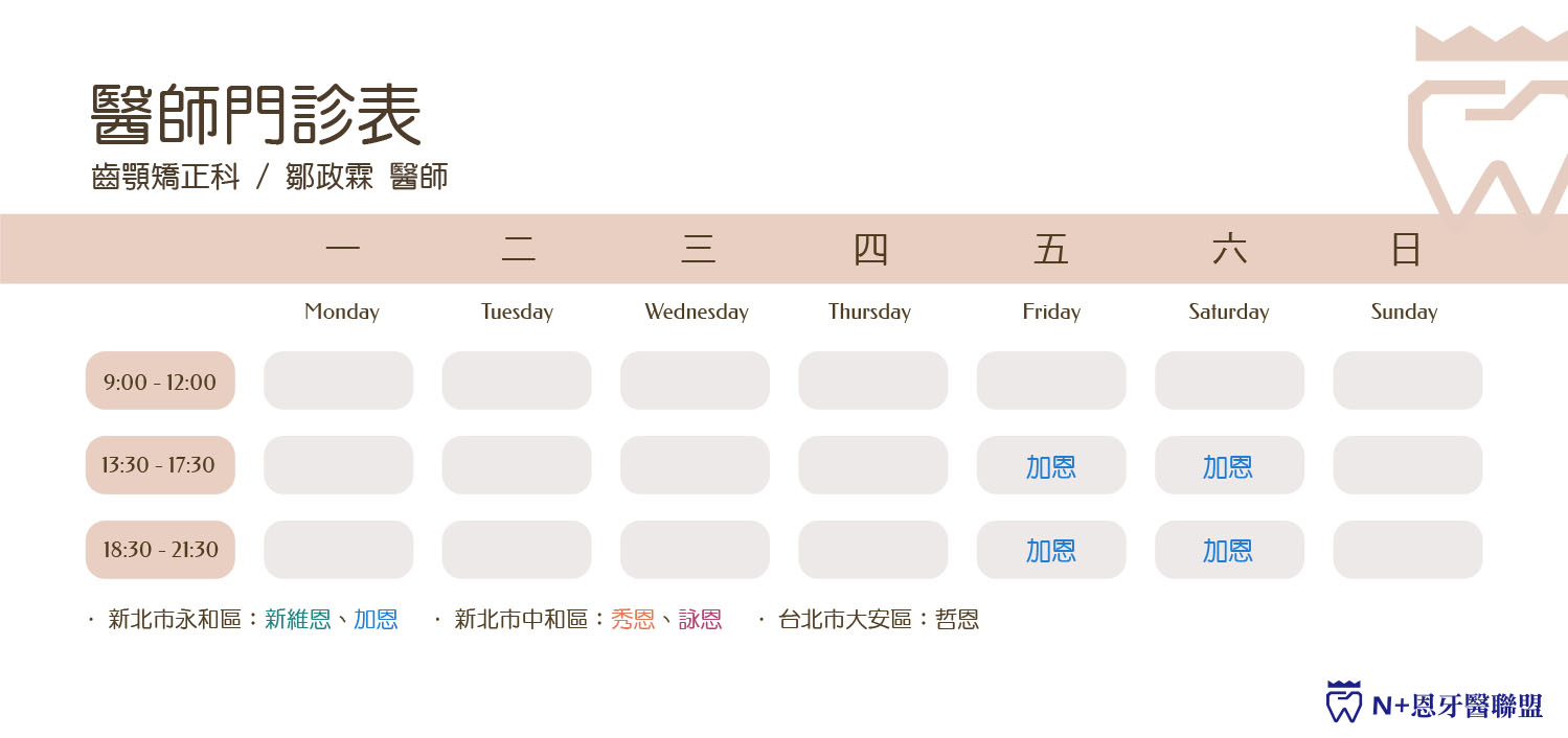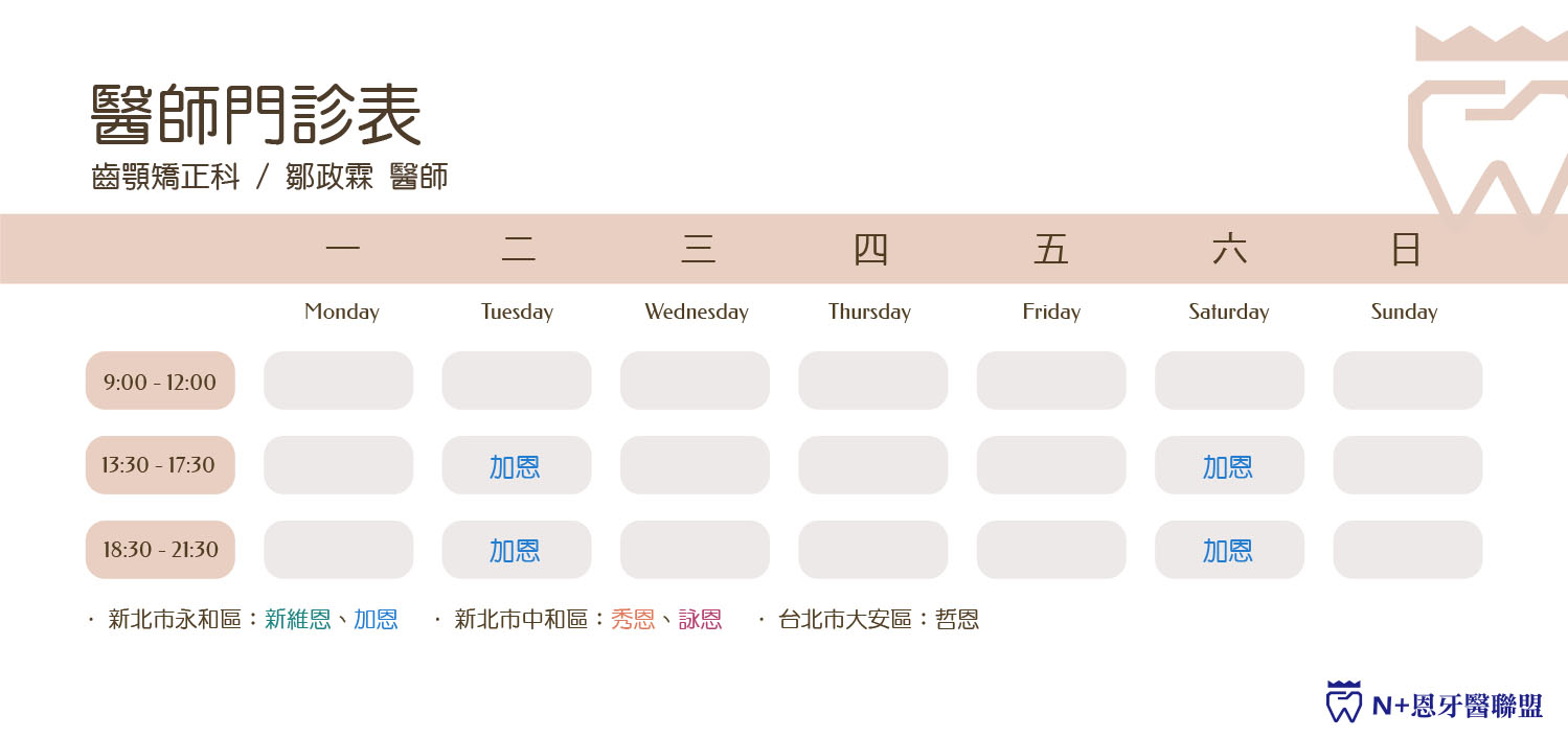 服務區域:加恩衛福部部定矯正專科醫師中華民國齒顎矯正學會專科醫師中華民國隱形矯正學會會員醫師隱適美Invisalign隱形矯正認證醫師臺灣大學牙醫學士前奇美醫院齒顎矯正科總醫師