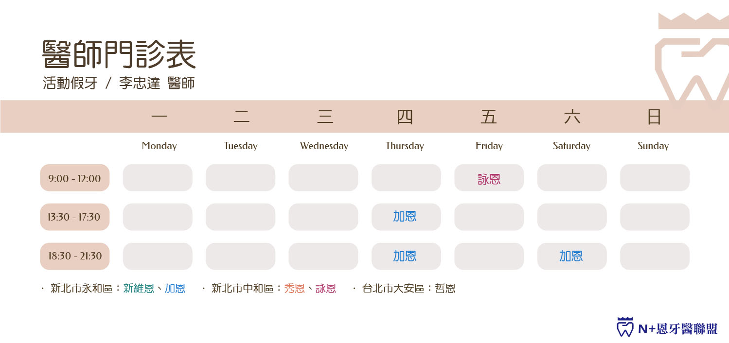 服務區域:加恩、詠恩高雄醫學大學牙醫學士高雄醫學大學贋復假牙碩士前高雄市立小港醫院代訓醫師台灣牙醫植體醫學會會員前南臺灣牙醫植體醫學會副秘書長
